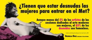 En 1989, las Guerrilla Girls se preguntaban: «¿Tienen que estar desnudas las mujeres para entrar en el Met?» (Museo Metropolitano de Arte de Nueva York), tras corroborar en ese entonces que menos del 5% de les artistas en la sección de arte moderno eran mujeres, al mismo tiempo que el 85% de los desnudos en el arte eran femeninos.