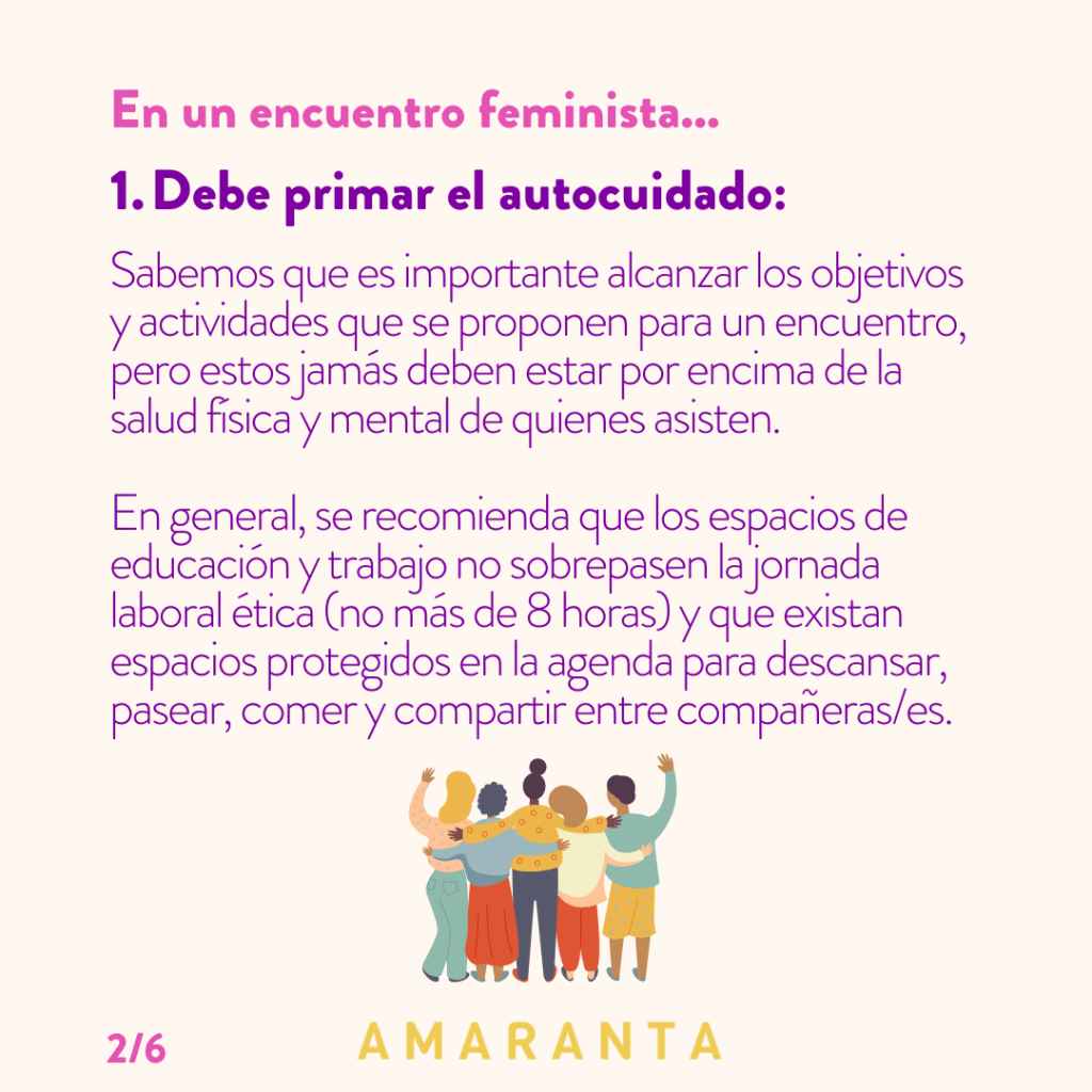 - Es más importante el autocuidado, que cumplir con absolutamente todo lo programado: Sabemos que es importante ir cumpliendo con los objetivos y actividades que se proponen para un encuentro, pero estos jamás deben estar por encima de la salud física y mental de quienes asisten. En general, se recomienda que los espacios de educación y trabajo no sobrepasen la jornada laboral ética (no más de 8 horas) y que existan espacios para descansar, pasear, comer y compartir entre compañeras/es.