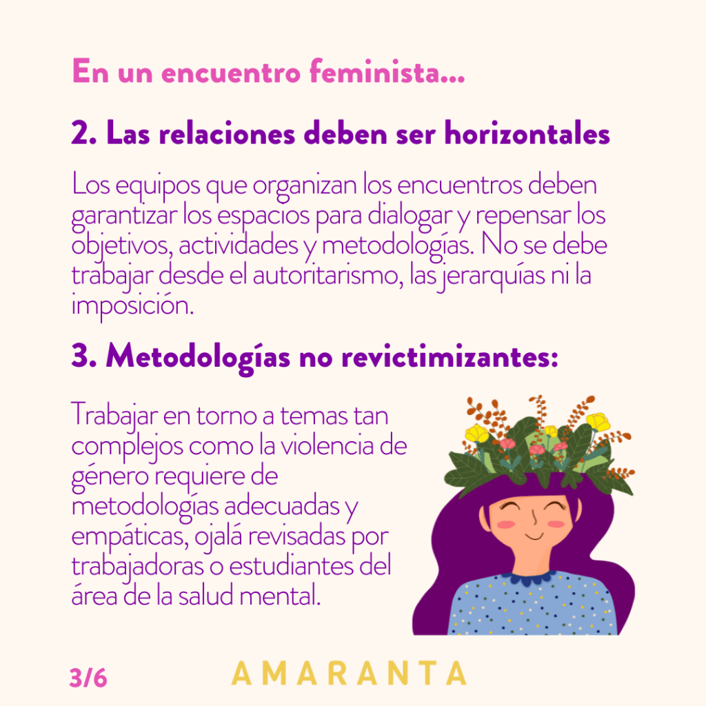 - No se deben repetir los tratos autoritarios y patriarcales con los que nos criamos: Gritar, maltratar, mentir, negar y mandar son acciones que jamás deben ocurrir en nuestros espacios feministas y de activismos.
