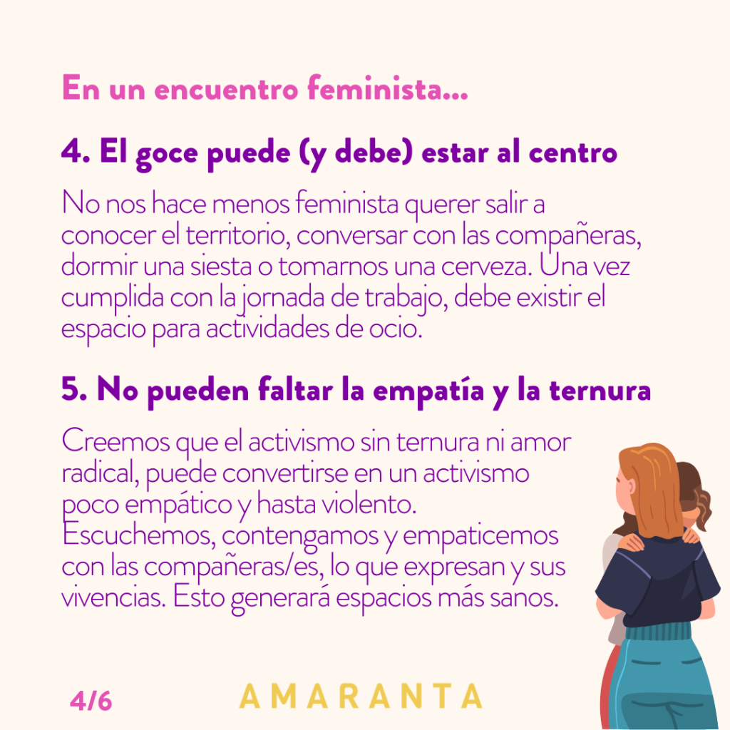 - El goce puede (y debe) estar al centro: No nos hace menos feminista querer salir a conocer el territorio, conversar con las compañeras, dormir una siesta o salir a tomarnos una cerveza. Una vez cumplida con la jornada de trabajo, debe existir el espacio para actividades de ocio, descanso y compañerismo.