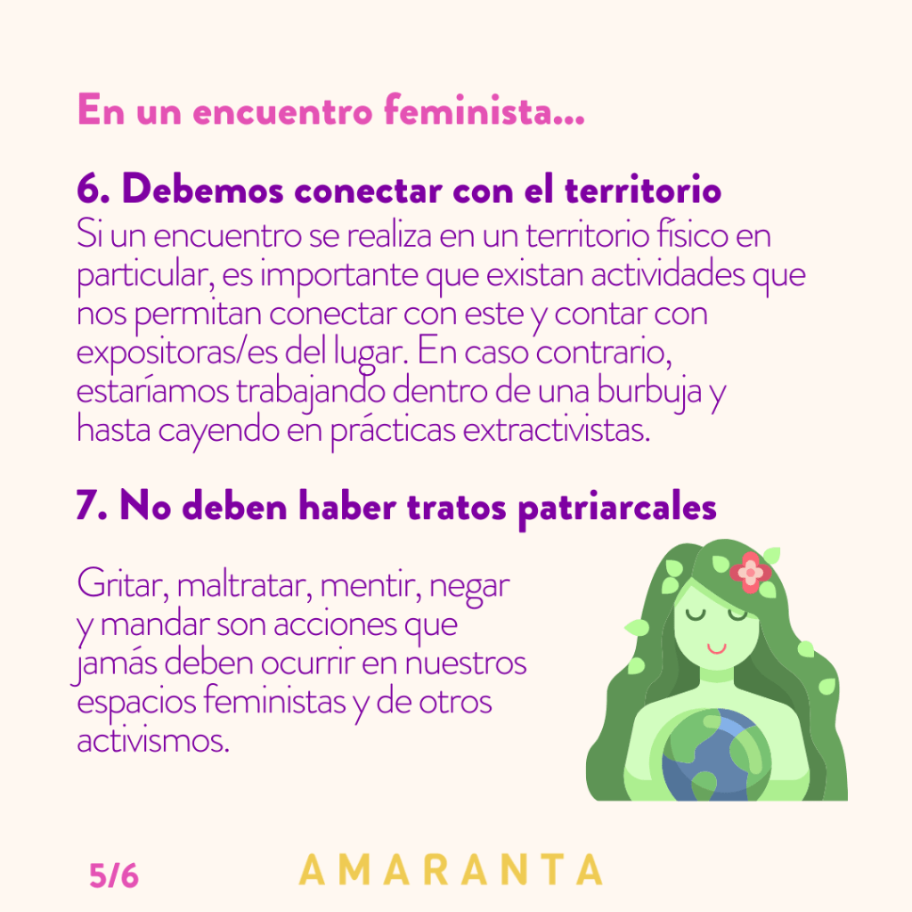 Además, compartimos un decálogo con lo que no se debe hacer y no puede faltar en un encuentro feminista, a raíz de las reflexiones surgidas en resistencia a esos malos tratos. Lo dejamos en versión de texto y como imágenes para compartir en redes sociales.