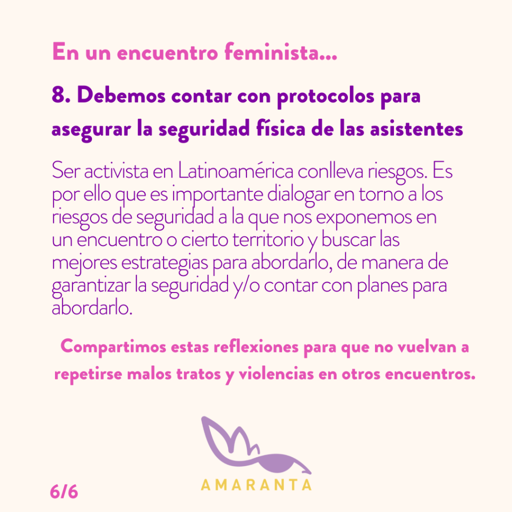 - Deben existir protocolos que garanticen la seguridad física de las y les asistentes: Ser activista en Latinoamérica conlleva riesgos. Es por ello que es importante dialogar en torno a los riesgos de seguridad a la que nos exponemos en un encuentro o cierto territorio y buscar las mejores estrategias para abordarlo, de manera de garantizar la seguridad y/o contar con planes para abordarlo.