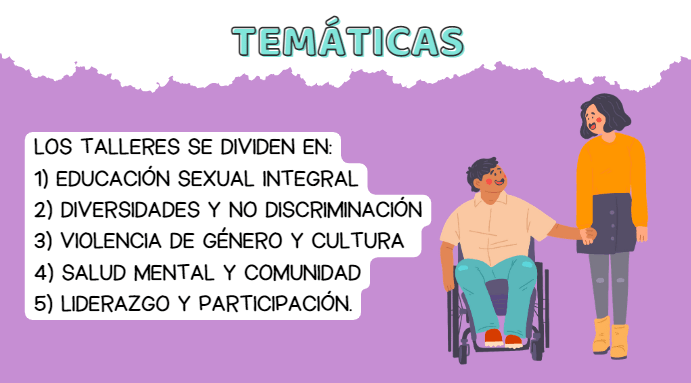 Cada ciclo de talleres aborda: Educación sexual integral, Diversidades y no Discriminación, Violencia de Género y cultura, Salud mental comunitaria y Participación. Y además del material educativo expositivo y actividades prácticas, incluye la entrega de material impreso, además de métodos de barrera (como condones de pene y vagina, dediles y máscaras bucales).