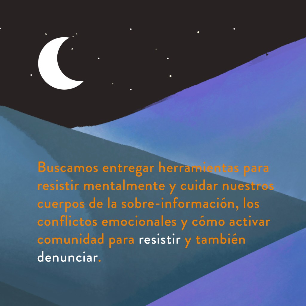 Somos compañeras investigando protocolos para la denuncia de violencia sexual en internet, en países que atraviesan la Cordillera de Los Andes. Buscamos entregar herramientas para resistir mentalmente y cuidar nuestros cuerpos de la sobre-información, los conflictos emocionales y cómo activar comunidad para resistir y también denunciar. Nos gusta la herbolaria y las tradiciones de nuestras ancestras así que estaremos compartiéndote rituales y saberes.
