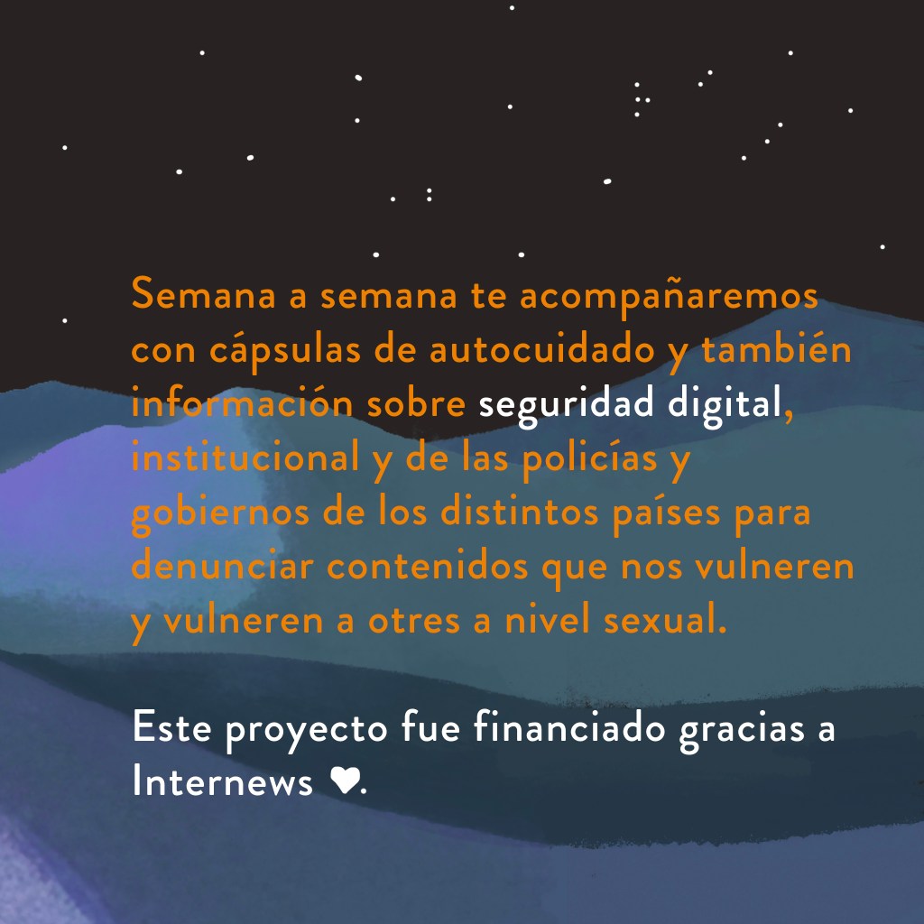 Semana a semana te acompañaremos con cápsulas de autocuidado y también información sobre seguridad digital, institucional y de las policías y gobiernos de los distintos países para denunciar contenidos que nos vulneren y vulneren a otres a nivel sexual.